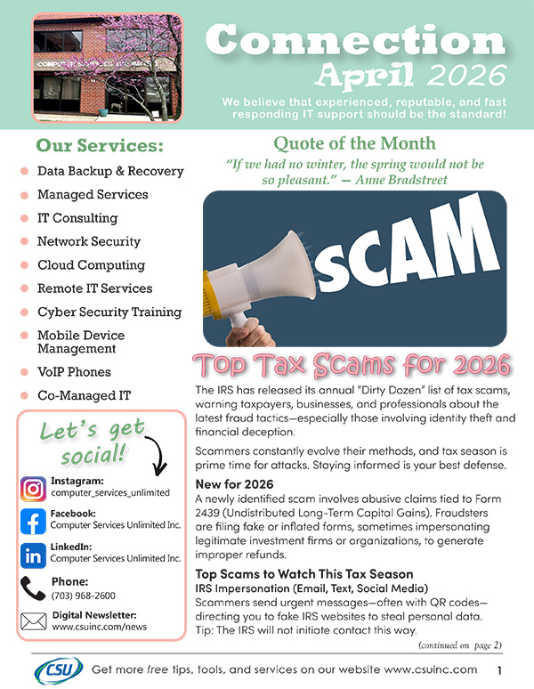 Our monthly “CSU Connection” newsletter will give you insider tips to make your business run faster, easier and more profitably. Our newsletter features articles about leadership, motivation and of course, technology and cyber-security. Fill out the form on the right to opt into our email newsletter and/or our hard-copy newsletter so you can make sure to never miss the latest in today’s technology!